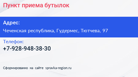 Пункт приема бутылок по адресу Чеченская республика, Гудермес, Тютчева, 97 в дальнейшем Организация, размещена в следующих категориях: