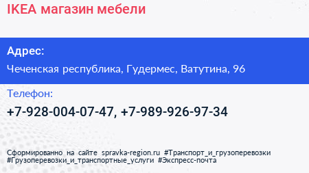 IKEA, магазин мебели по адресу Чеченская республика, Гудермес, Ватутина, 96 в дальнейшем Организация, размещена в следующих категориях: