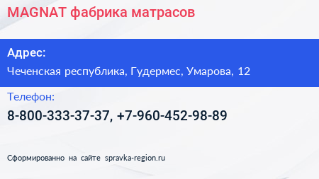 MAGNAT, фабрика матрасов по адресу Чеченская республика, Гудермес, Умарова, 12 в дальнейшем Организация, размещена в следующих категориях: