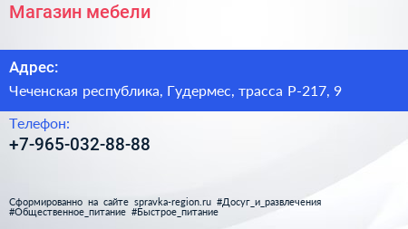 Магазин мебели по адресу Чеченская республика, Гудермес, трасса Р-217, 9 в дальнейшем Организация, размещена в следующих категориях: