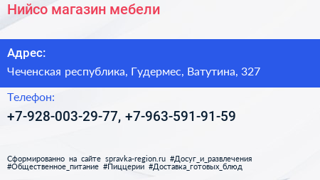 Нийсо, магазин мебели по адресу Чеченская республика, Гудермес, Ватутина, 327 в дальнейшем Организация, размещена в следующих категориях: