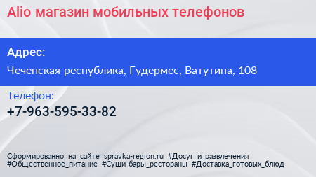 Alio, магазин мобильных телефонов по адресу Чеченская республика, Гудермес, Ватутина, 108 в дальнейшем Организация, размещена в следующих категориях:
