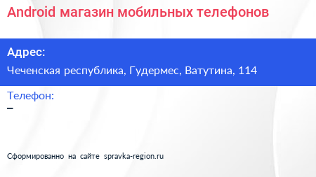 Android, магазин мобильных телефонов по адресу Чеченская республика, Гудермес, Ватутина, 114 в дальнейшем Организация, размещена в следующих категориях: