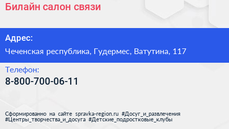 Билайн, салон связи по адресу Чеченская республика, Гудермес, Ватутина, 117 в дальнейшем Организация, размещена в следующих категориях: