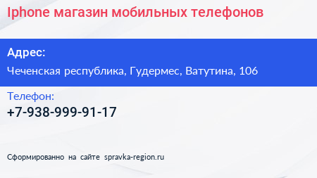 Iphone, магазин мобильных телефонов по адресу Чеченская республика, Гудермес, Ватутина, 106 в дальнейшем Организация, размещена в следующих категориях: