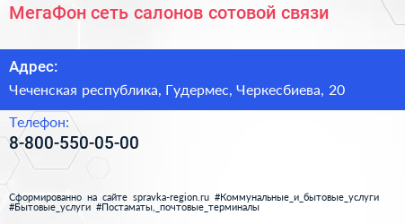 МегаФон, сеть салонов сотовой связи по адресу Чеченская республика, Гудермес, Черкесбиева, 20 в дальнейшем Организация, размещена в следующих категориях: