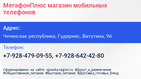 МегафонПлюс, магазин мобильных телефонов по адресу Чеченская республика, Гудермес, Ватутина, 96 в дальнейшем Организация, размещена в следующих категориях: