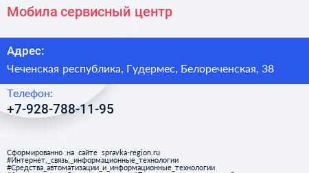 Мобила, сервисный центр по адресу Чеченская республика, Гудермес, Белореченская, 38 в дальнейшем Организация, размещена в следующих категориях: