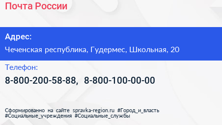 Почта России по адресу Чеченская республика, Гудермес, Школьная, 20 в дальнейшем Организация, размещена в следующих категориях: