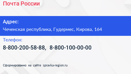 Почта России по адресу Чеченская республика, Гудермес, Кирова, 164 в дальнейшем Организация, размещена в следующих категориях: