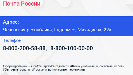 Почта России по адресу Чеченская республика, Гудермес, Махадаева, 22а в дальнейшем Организация, размещена в следующих категориях: