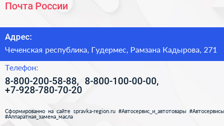 Почта России по адресу Чеченская республика, Гудермес, Рамзана Кадырова, 271 в дальнейшем Организация, размещена в следующих категориях: