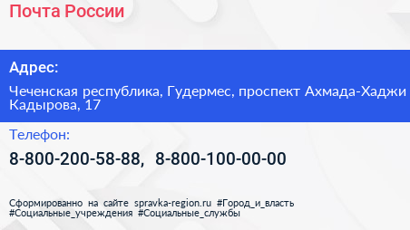 Почта России по адресу Чеченская республика, Гудермес, проспект Ахмада-Хаджи Кадырова, 17 в дальнейшем Организация, размещена в следующих категориях: