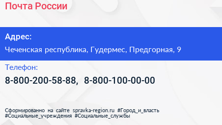 Почта России по адресу Чеченская республика, Гудермес, Предгорная, 9 в дальнейшем Организация, размещена в следующих категориях: