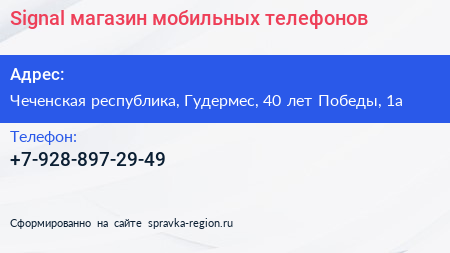 Signal, магазин мобильных телефонов по адресу Чеченская республика, Гудермес, 40 лет Победы, 1а в дальнейшем Организация, размещена в следующих категориях: