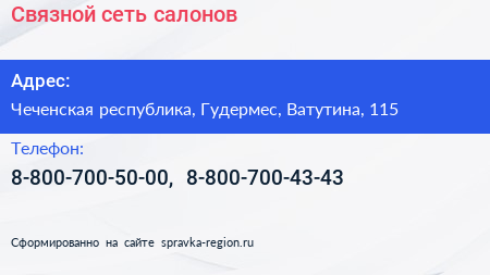 Связной, сеть салонов по адресу Чеченская республика, Гудермес, Ватутина, 115 в дальнейшем Организация, размещена в следующих категориях:
