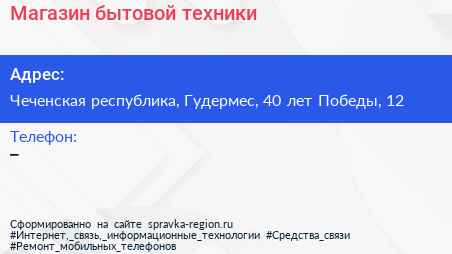 Магазин бытовой техники по адресу Чеченская республика, Гудермес, 40 лет Победы, 12 в дальнейшем Организация, размещена в следующих категориях: