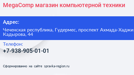 MegaComp, магазин компьютерной техники по адресу Чеченская республика, Гудермес, проспект Ахмада-Хаджи Кадырова, 44 в дальнейшем Организация, размещена в следующих категориях: