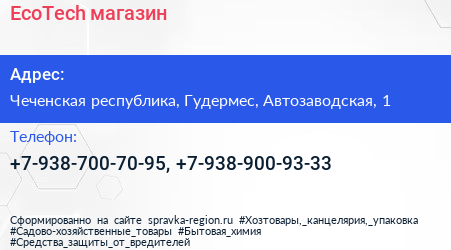 EcoTech, магазин по адресу Чеченская республика, Гудермес, Автозаводская, 1 в дальнейшем Организация, размещена в следующих категориях: