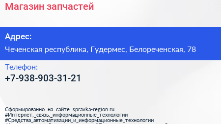 Магазин запчастей по адресу Чеченская республика, Гудермес, Белореченская, 78 в дальнейшем Организация, размещена в следующих категориях: