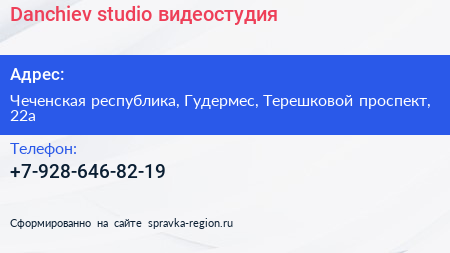 Danchiev studio, видеостудия по адресу Чеченская республика, Гудермес, Терешковой проспект, 22а в дальнейшем Организация, размещена в следующих категориях: