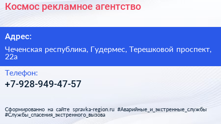 Космос, рекламное агентство по адресу Чеченская республика, Гудермес, Терешковой проспект, 22а в дальнейшем Организация, размещена в следующих категориях: