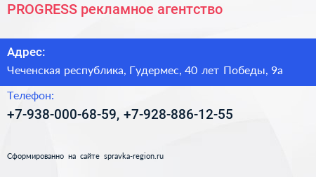PROGRESS, рекламное агентство по адресу Чеченская республика, Гудермес, 40 лет Победы, 9а в дальнейшем Организация, размещена в следующих категориях: