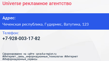 Universe, рекламное агентство по адресу Чеченская республика, Гудермес, Ватутина, 123 в дальнейшем Организация, размещена в следующих категориях: