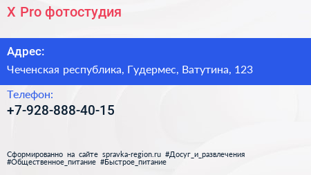 X-Pro, фотостудия по адресу Чеченская республика, Гудермес, Ватутина, 123 в дальнейшем Организация, размещена в следующих категориях: