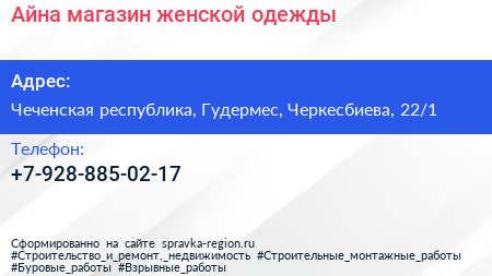 Айна, магазин женской одежды по адресу Чеченская республика, Гудермес, Черкесбиева, 22/1 в дальнейшем Организация, размещена в следующих категориях: