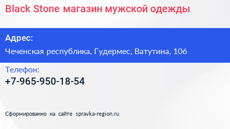 Black Stone, магазин мужской одежды по адресу Чеченская республика, Гудермес, Ватутина, 106 в дальнейшем Организация, размещена в следующих категориях: