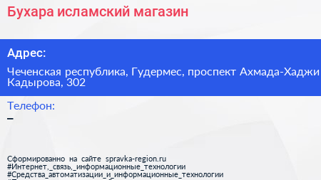 Бухара, исламский магазин по адресу Чеченская республика, Гудермес, проспект Ахмада-Хаджи Кадырова, 302 в дальнейшем Организация, размещена в следующих категориях: