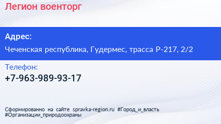 Легион, военторг по адресу Чеченская республика, Гудермес, трасса Р-217, 2/2 в дальнейшем Организация, размещена в следующих категориях:
