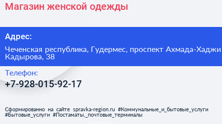 Магазин женской одежды по адресу Чеченская республика, Гудермес, проспект Ахмада-Хаджи Кадырова, 38 в дальнейшем Организация, размещена в следующих категориях: