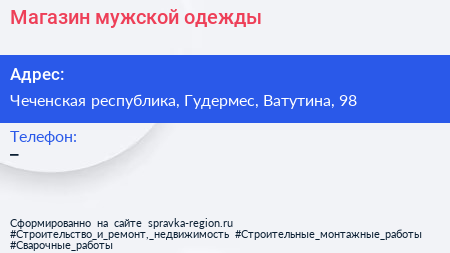 Магазин мужской одежды по адресу Чеченская республика, Гудермес, Ватутина, 98 в дальнейшем Организация, размещена в следующих категориях:
