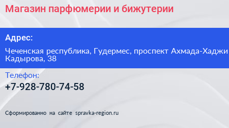 Магазин парфюмерии и бижутерии по адресу Чеченская республика, Гудермес, проспект Ахмада-Хаджи Кадырова, 38 в дальнейшем Организация, размещена в следующих категориях: