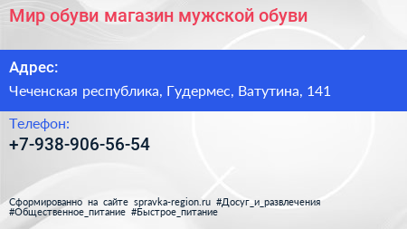Мир обуви, магазин мужской обуви по адресу Чеченская республика, Гудермес, Ватутина, 141 в дальнейшем Организация, размещена в следующих категориях: