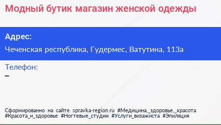 Модный бутик, магазин женской одежды по адресу Чеченская республика, Гудермес, Ватутина, 113а в дальнейшем Организация, размещена в следующих категориях:
