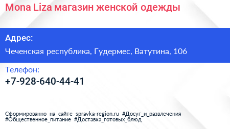 Mona Liza, магазин женской одежды по адресу Чеченская республика, Гудермес, Ватутина, 106 в дальнейшем Организация, размещена в следующих категориях: