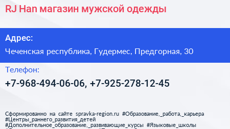 RJ Han, магазин мужской одежды по адресу Чеченская республика, Гудермес, Предгорная, 30 в дальнейшем Организация, размещена в следующих категориях: