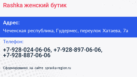 Rashka, женский бутик по адресу Чеченская республика, Гудермес, переулок Хатаева, 7а в дальнейшем Организация, размещена в следующих категориях: