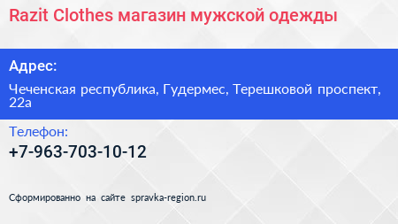 Razit Clothes, магазин мужской одежды по адресу Чеченская республика, Гудермес, Терешковой проспект, 22а в дальнейшем Организация, размещена в следующих категориях: