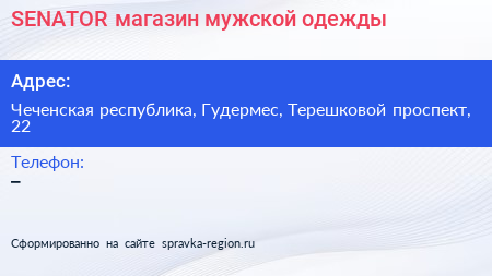 SENATOR, магазин мужской одежды по адресу Чеченская республика, Гудермес, Терешковой проспект, 22 в дальнейшем Организация, размещена в следующих категориях: