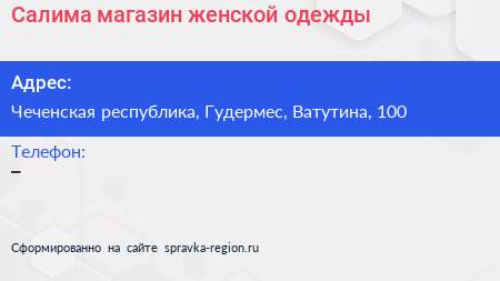 Салима, магазин женской одежды по адресу Чеченская республика, Гудермес, Ватутина, 100 в дальнейшем Организация, размещена в следующих категориях: