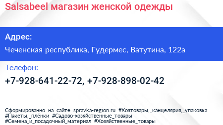 Salsabeel, магазин женской одежды по адресу Чеченская республика, Гудермес, Ватутина, 122а в дальнейшем Организация, размещена в следующих категориях: