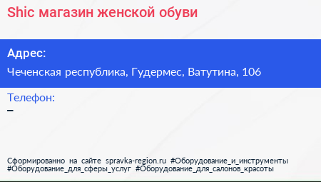 Shic, магазин женской обуви по адресу Чеченская республика, Гудермес, Ватутина, 106 в дальнейшем Организация, размещена в следующих категориях: