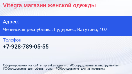 Vitegra, магазин женской одежды по адресу Чеченская республика, Гудермес, Ватутина, 107 в дальнейшем Организация, размещена в следующих категориях:
