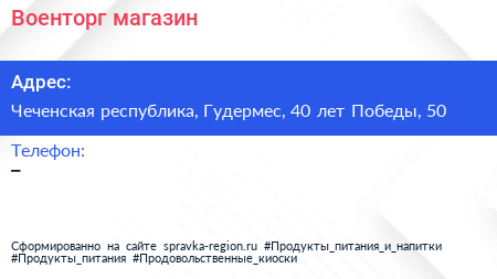 Военторг, магазин по адресу Чеченская республика, Гудермес, 40 лет Победы, 50 в дальнейшем Организация, размещена в следующих категориях: