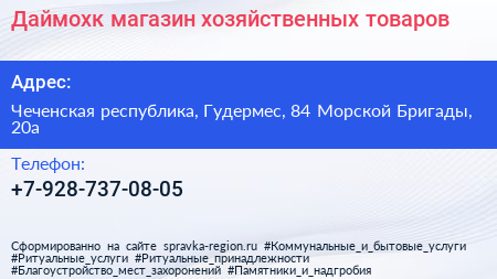 Даймохк, магазин хозяйственных товаров по адресу Чеченская республика, Гудермес, 84 Морской Бригады, 20а в дальнейшем Организация, размещена в следующих категориях:
