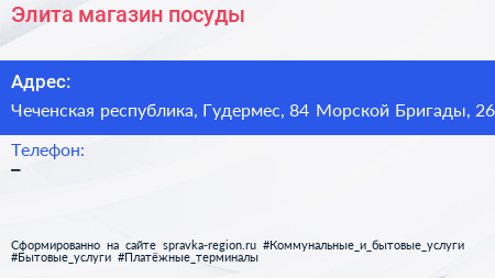 Элита, магазин посуды по адресу Чеченская республика, Гудермес, 84 Морской Бригады, 26 в дальнейшем Организация, размещена в следующих категориях: